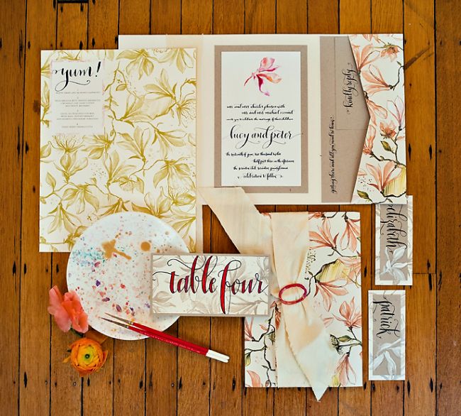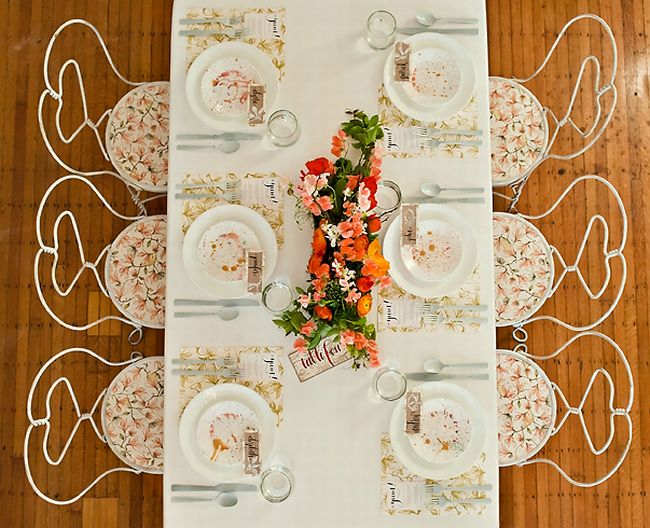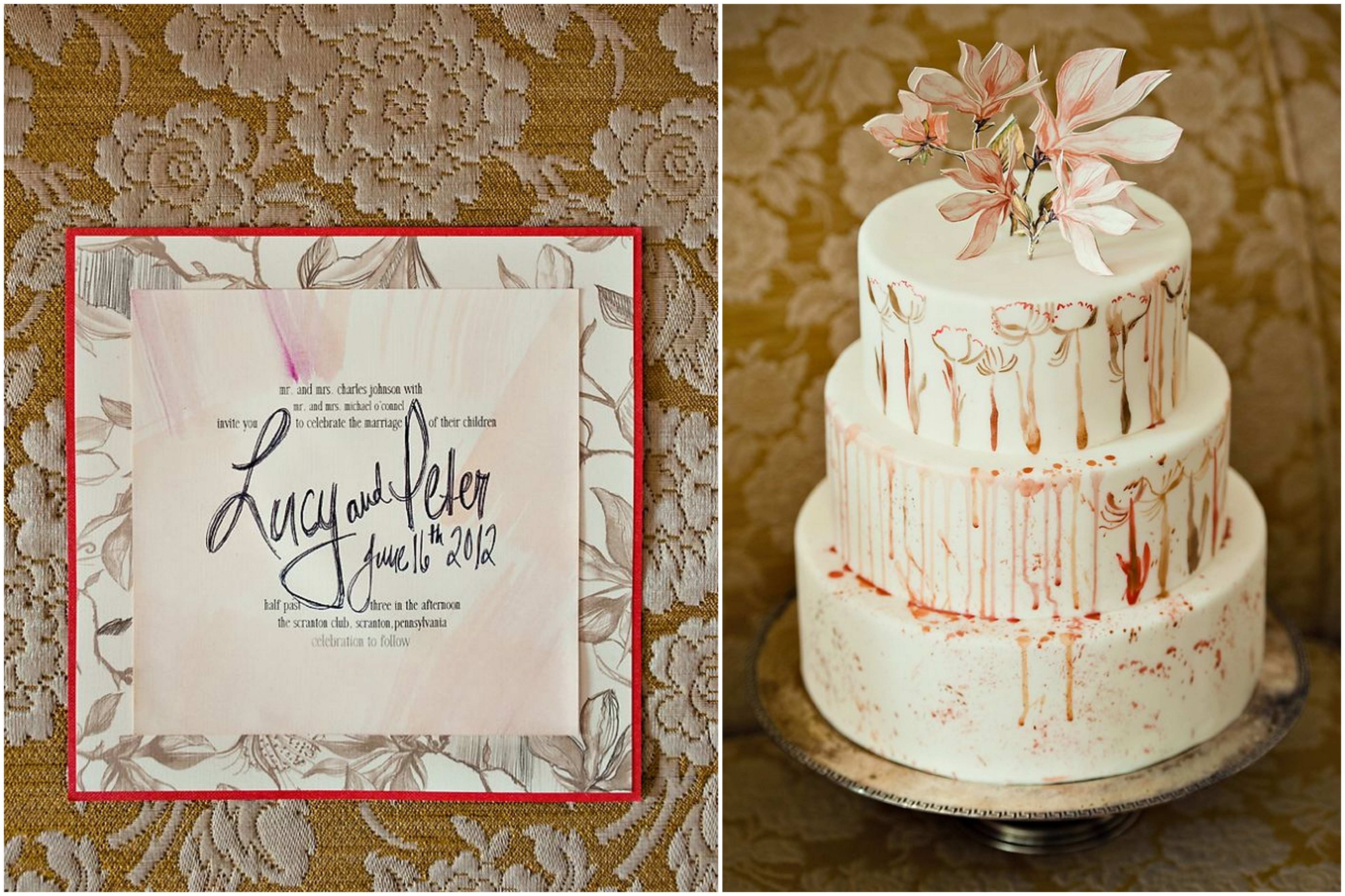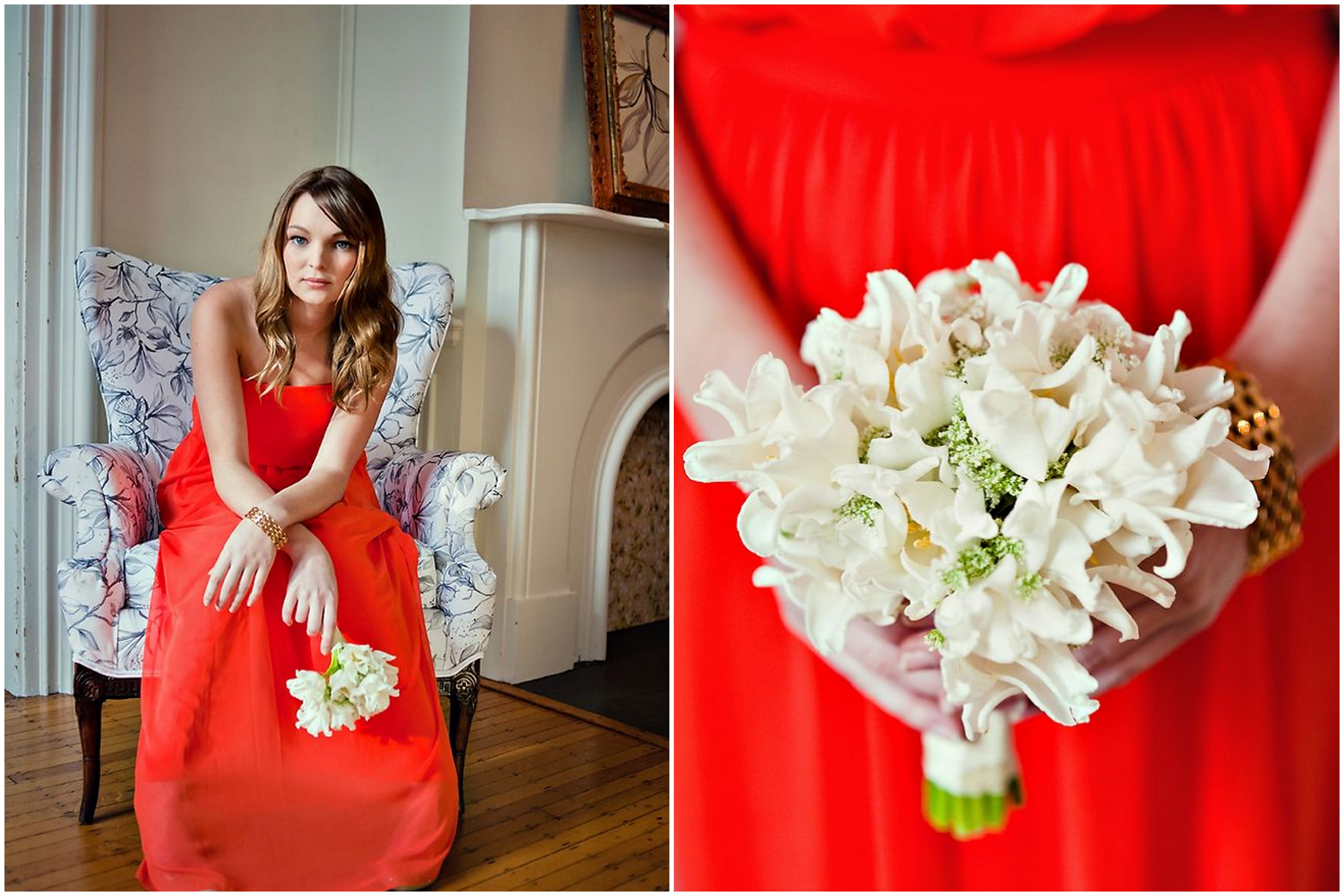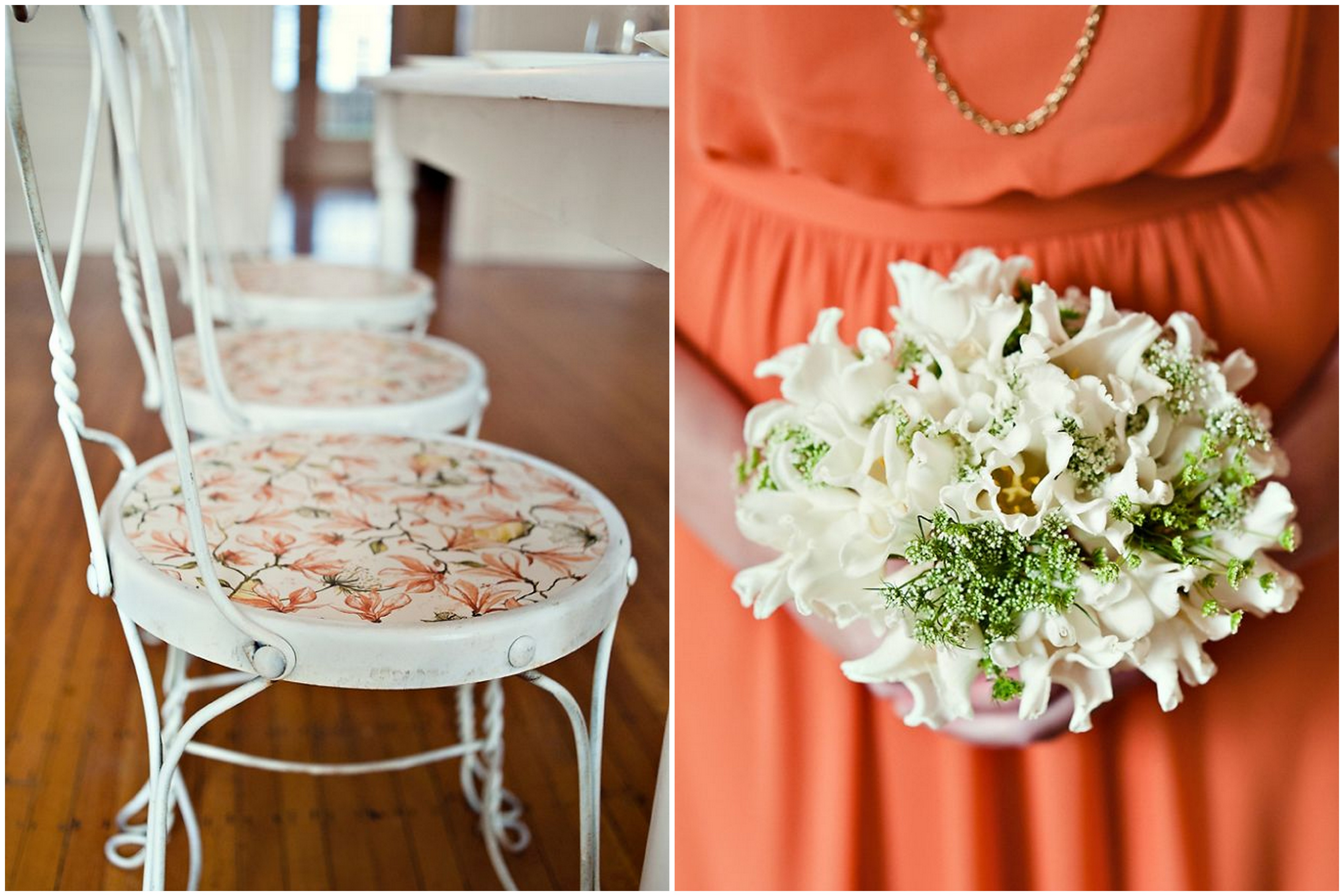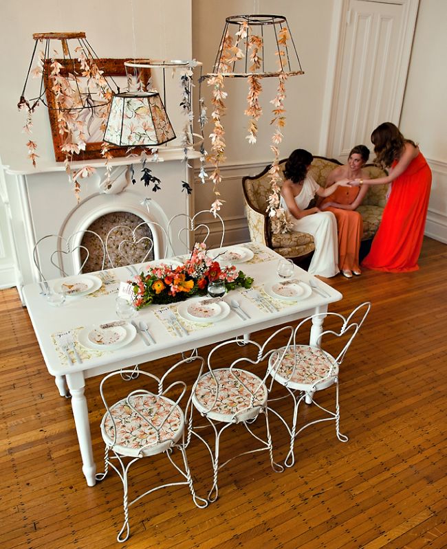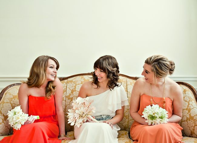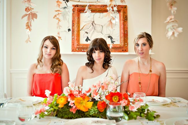 I LOVE this Tangerine Tango Trellis pattern shoot shoot! You may have seen it on Green Wedding Shoes earlier this week but between the beauty and that it was created by us and some amazing Pennsylvania vendors , I just had to share it with my readers as well! The shoot comes across very clean and organic (two of my favorite traits) but also includes bright pops of color that is warm and inviting. We worked with Kristy Rice, of Momental Designs on this project and she truly created a modern, sophisticated setting. She described the shoot saying, “The Trellis pattern has the unique ability to transcend paper and inspire well beyond correspondence. To show Trellis’ true design impact and versatility, I envisioned it in a lifestyle space where walls are covered, chairs are upholstered and pillows are stuffed.” The new collection of Envelopments patterns created exclusively from hand painted elements by Kristy are stunning and flow throughout the shoot. The models used in the shoot were each dressed in Desla Couture gowns with custom belts encrusted with rhinestone detailing that are to die for! Those colors are insanely fabulous, right?! The three cakes were all made in collaboration with Truly Scrumptious and that cute Ring Bearer Bowl® is a little sneak peak into a future project with another one of my favorites, Paloma’s Nest!