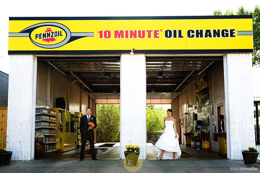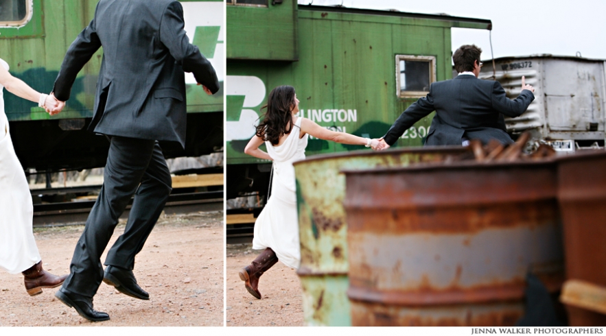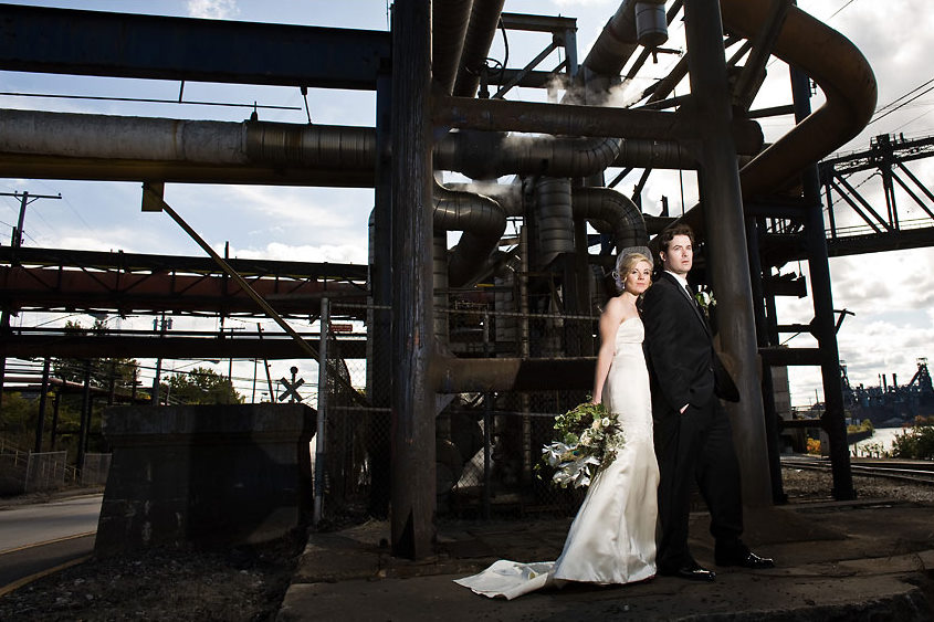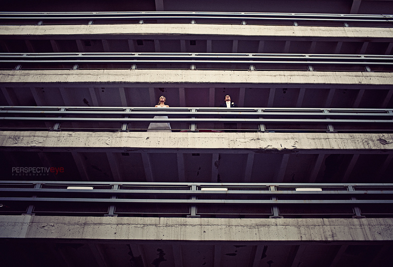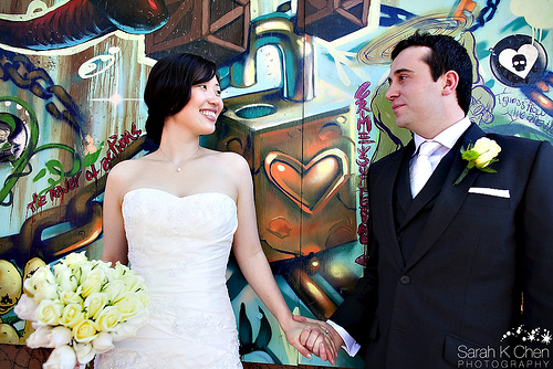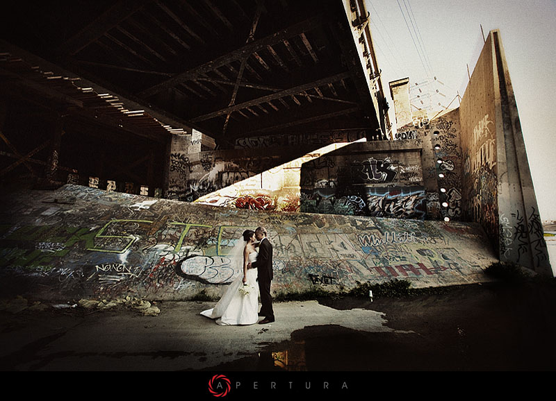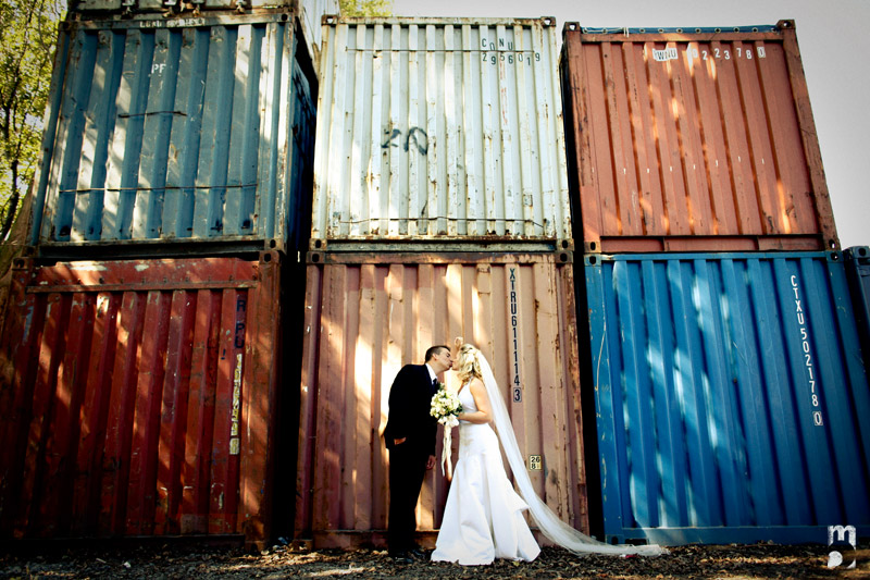 I love when wedding or engagement photos are unconventional, at one point I thought if I never saw another bride and groom in jeans and white tops frolicking on the beach, it would be too soon. Although we are seeing it more and more and I really enjoy the juxtaposition of a bride and groom set against a harsh urban or industrial environment. It just makes for very visually interesting pictures and I always think the people in them must be hip and cool. Some of the locations below are so extremely random and just make me enjoy the shots even more. Thank you photographers for continually thinking outside of the wedding box and helping us to extend our visual palates with these urban weddings!