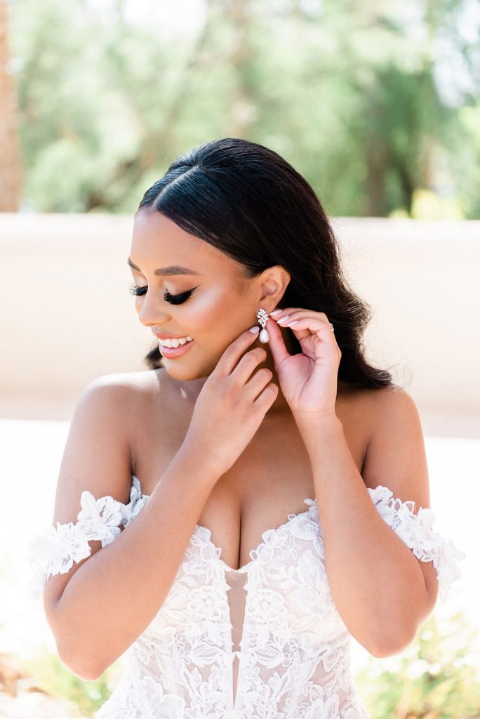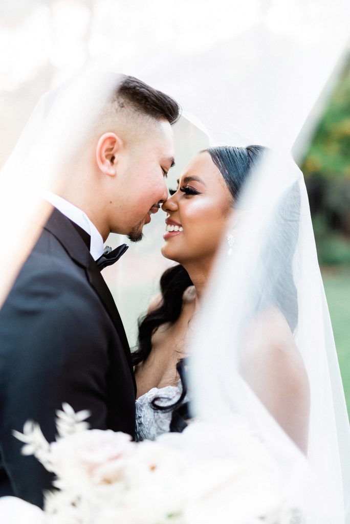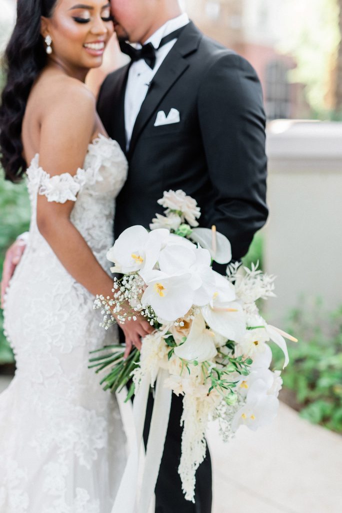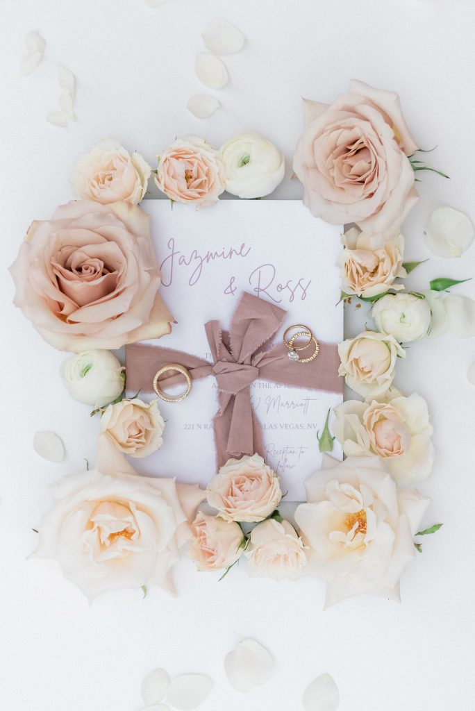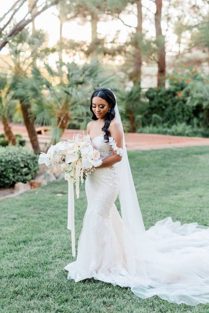 “Jazmine & Ross envisioned a romantic, intimate garden wedding. She wanted the colors and decor to be soft, dreamy, romantic, and neutral with a touch of blush. They chose the JW Marriott Resort just off the Las Vegas Strip, which was the perfect location to get lush greenery in their portraits, despite being in the desert. Jazmine also wanted to represent her Hawaiian heritage throughout the day with little touches. Tropical white orchids and anthuriums adorned her bouquet, which was accented with roses and baby’s breath. This brought together the romantic, ethereal vibe they were going for. During the reception, Jazmine danced a traditional Hawaiian wedding hula for her husband, wowing guests with the special cultural moment.”
