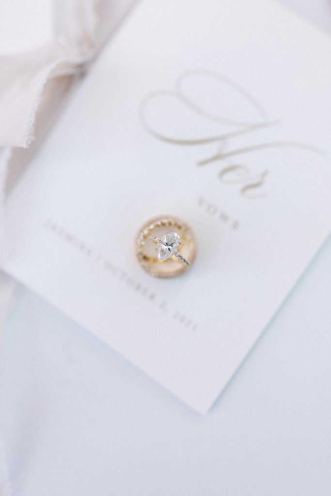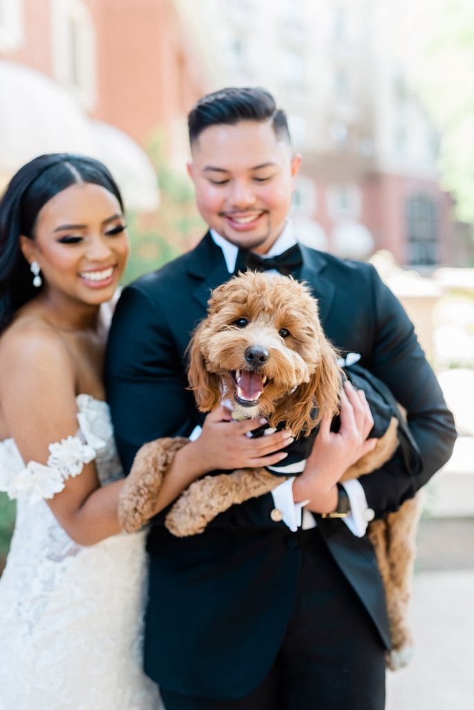 “The couple met in 2016, on the first day of nursing school. After years of being study buddies, they realized they were meant for more. They got engaged in Ross’s hometown of New York City, where he proposed to Jazmine at the top of the Rockefeller Center. Their beloved golden doodle, Rocky, made an appearance at their first look and ceremony, to honor the place they got engaged.
