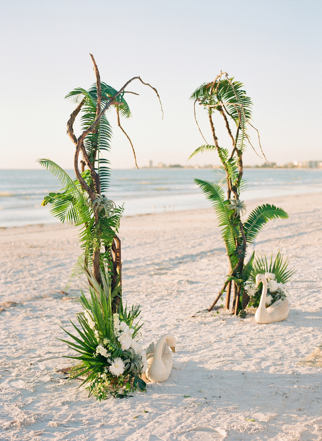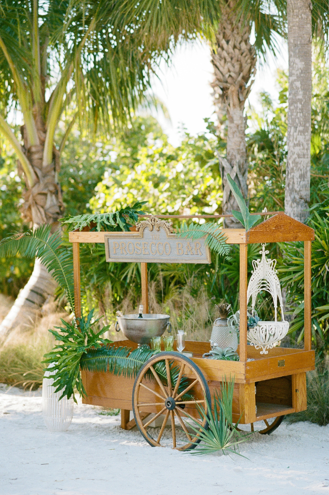 A mid-century modern resort located in the heart of Sarasota, Captiva Beach Resort on Siesta Key, has recently opened up a brand new space available for weddings. Within walking distance to the resort is a beautiful space with sand and gorgeous tropical palm trees and foliage surrounding it. With the amazing planning of Be Wed SRQ and many other local Sarasota vendors we really wanted to create something unique and different with a vintage vibe to match the resort. The unique ceremony arch on the beach by So Staged was truly a show stopper, as was the furniture set up and we can’t forget to mention the Prosecco cart. The vintage hat (found on Etsy) pulled everything together seamlessly.