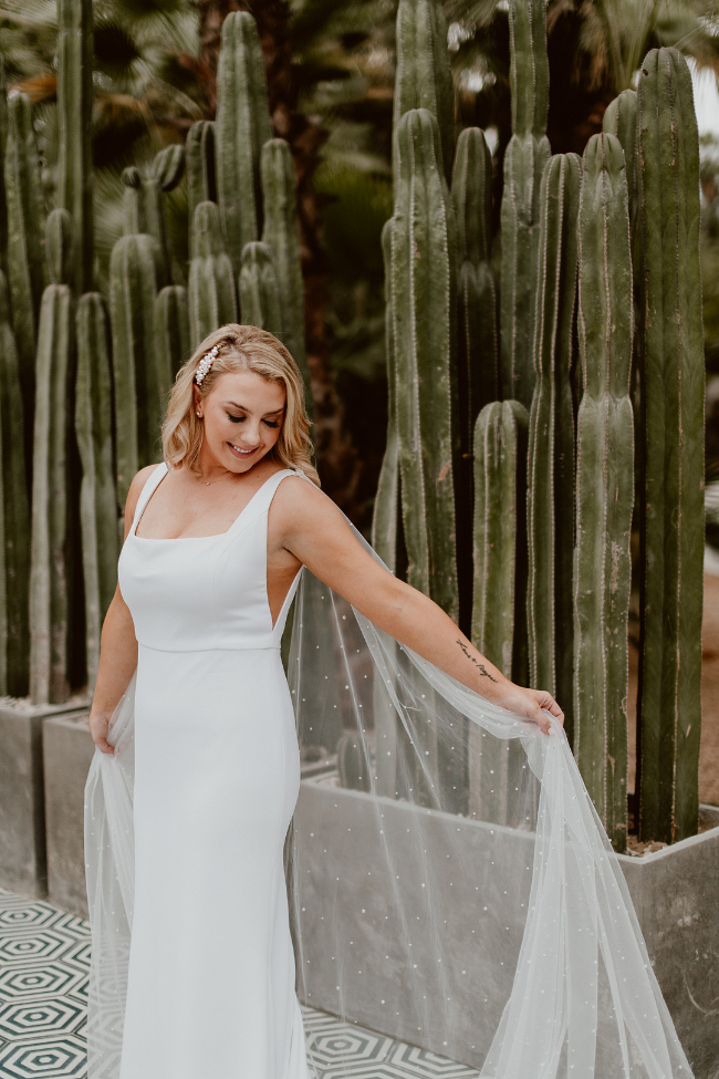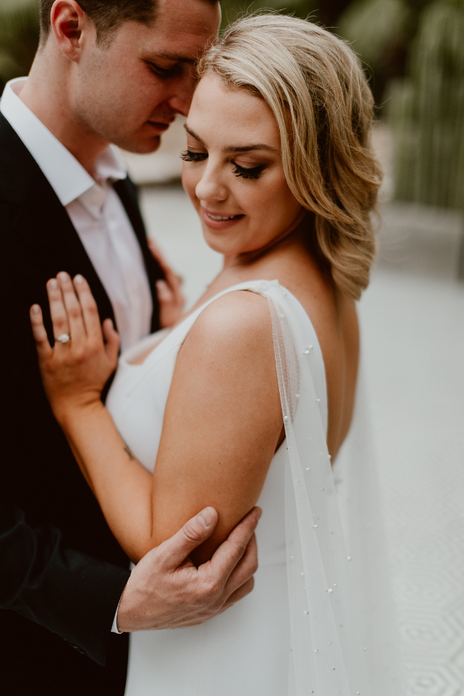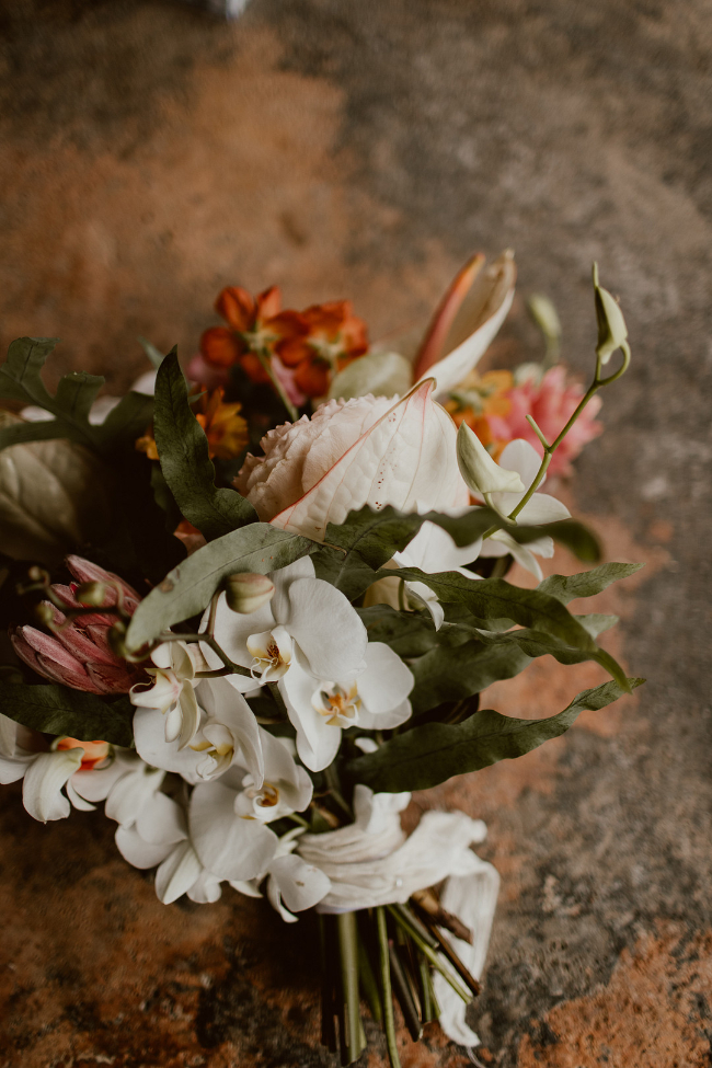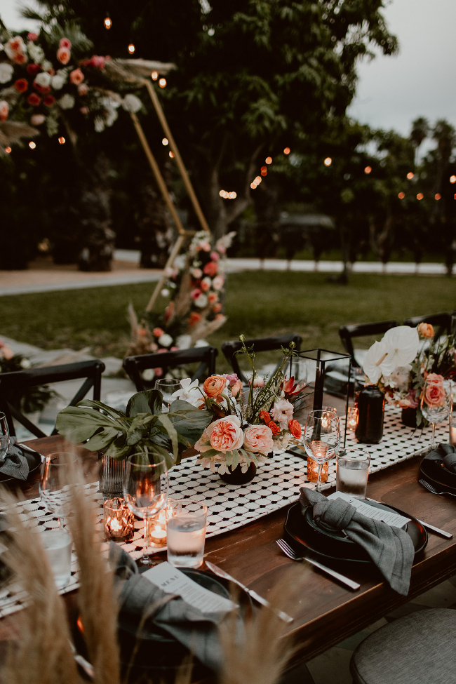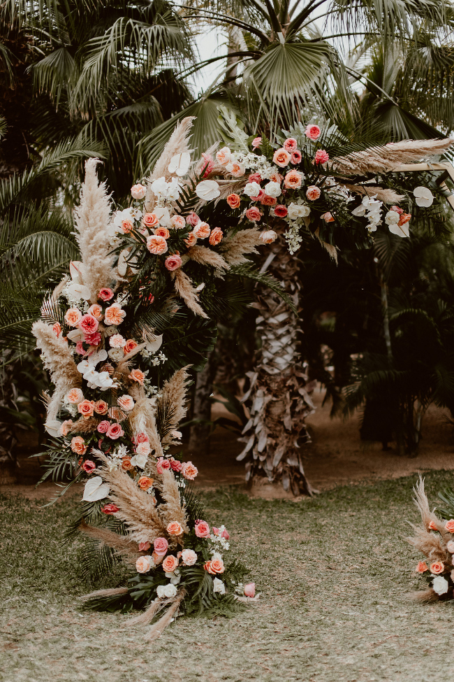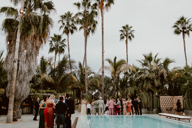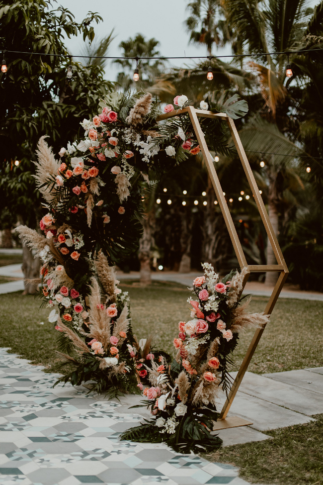 Through the power of Instagram, we found our talented team of vendors, including Fatima Falcon of Momentos Los Cabos, who helped connect us with the best local vendors. On the first of February eighty-five of our closest family and friends gathered to celebrate with us as we exchanged vows underneath the verdant palms at Acre. A stunning octagon floral arch hosted an eclectic array of flowers including white orchids, pampas grass, anthuriums, and pops of warm pastel-colored floral that perfectly captured Cabo’s picturesque sunsets.