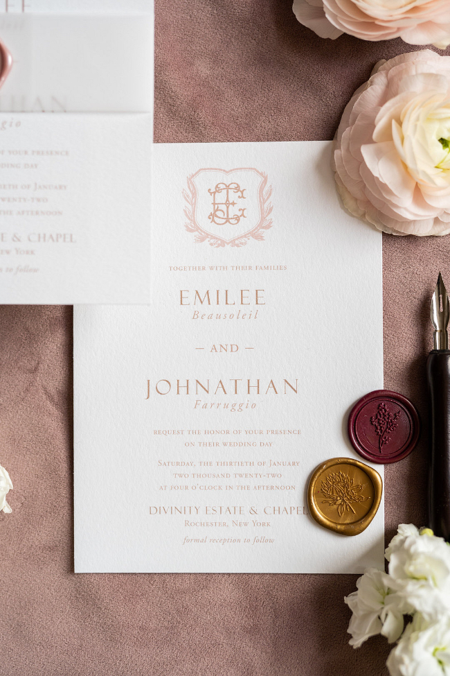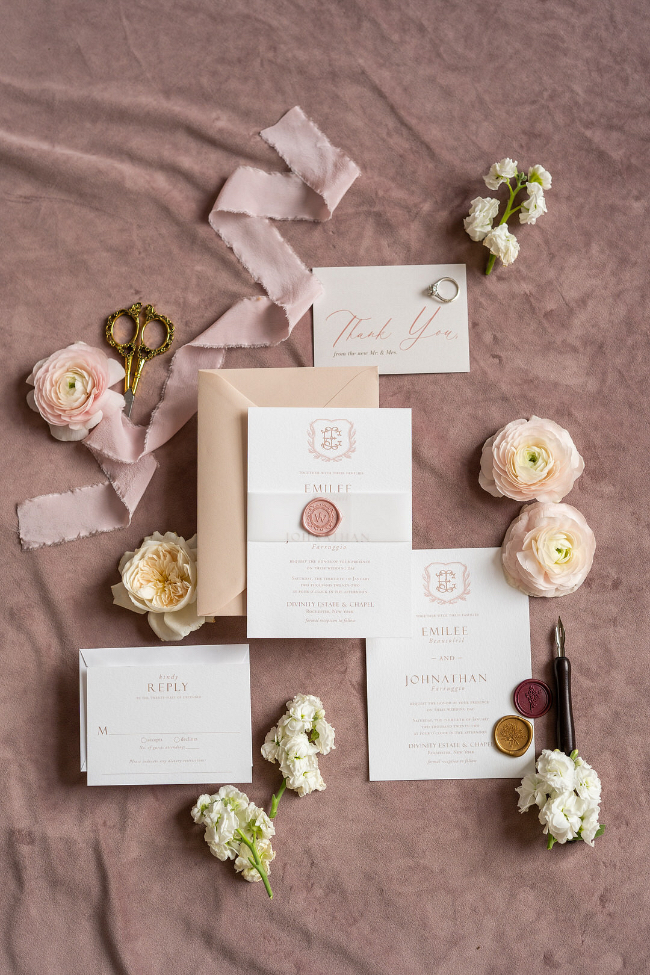 If you are looking to step back in time while maintaining a modern flair, this wedding at the Historic Divinity Estate is for you. Each element combines effortless beauty with a feeling of the past. The stationery creates the scene, only added to by the reception space and elegant bridal apparel. The cake brings in that modern feeling with all white and subtle details on the side. These vendors transformed an already beautiful space into something even more amazing. We cannot get enough of it!