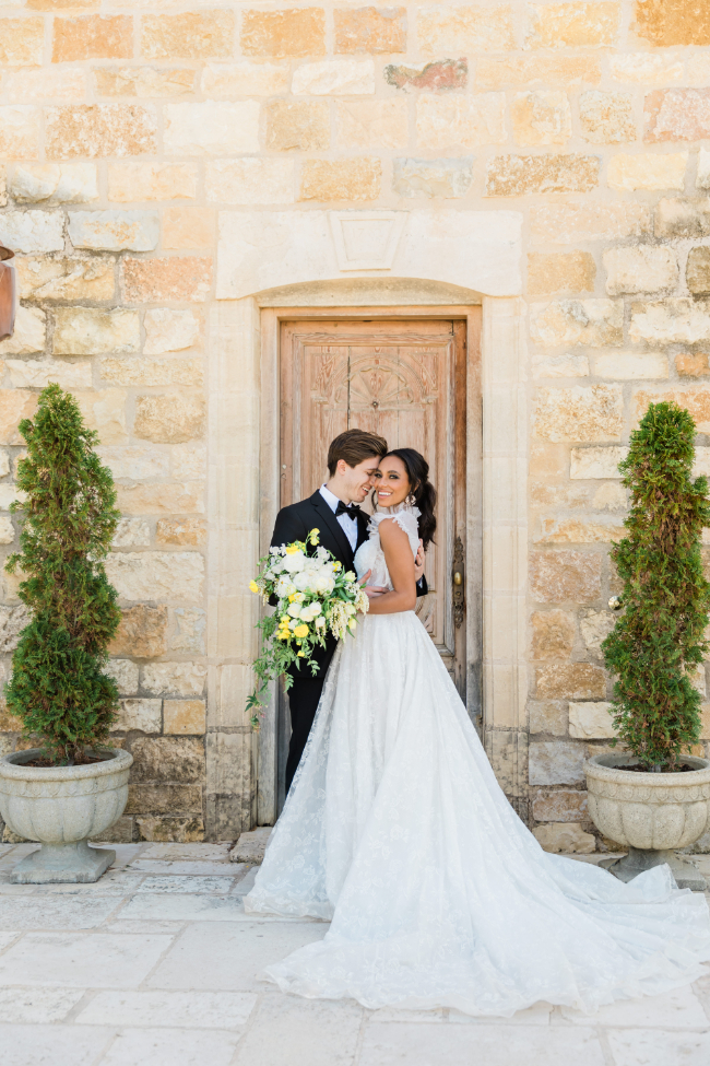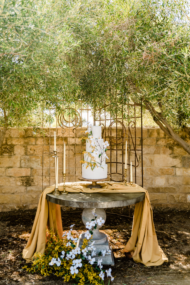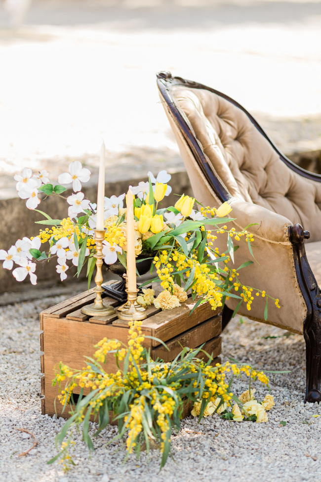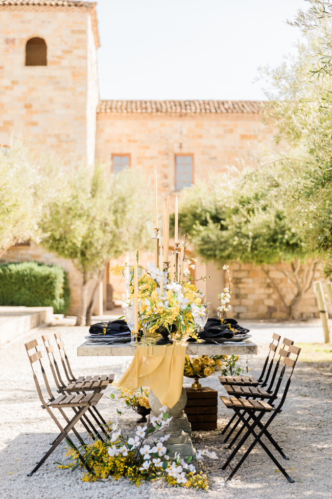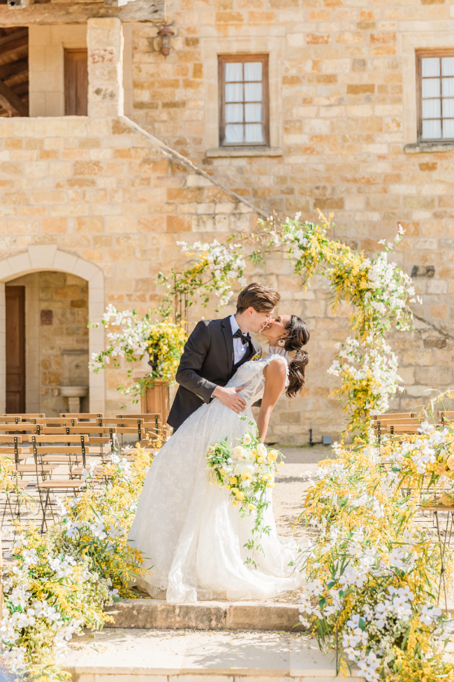 This bold yellow shoot had sunshine on our minds! “Whimsical with a modern flair” were the words that came to mind during this beautiful shoot at Sunstone Winery in Santa Ynez Valley, California. The delicate white and yellow flowers paired with bold black made for a unique concept that highlighted Pantone’s color of the year!The sophisticated color palette and mix of modern accents and classic, soft touches created the perfect old-meets-new design concept that highlighted the beauty of the venue.