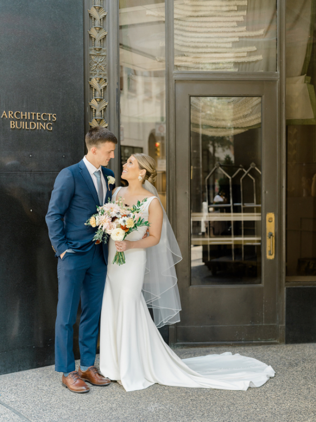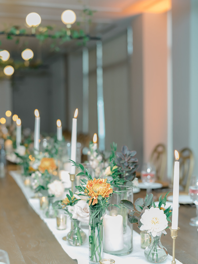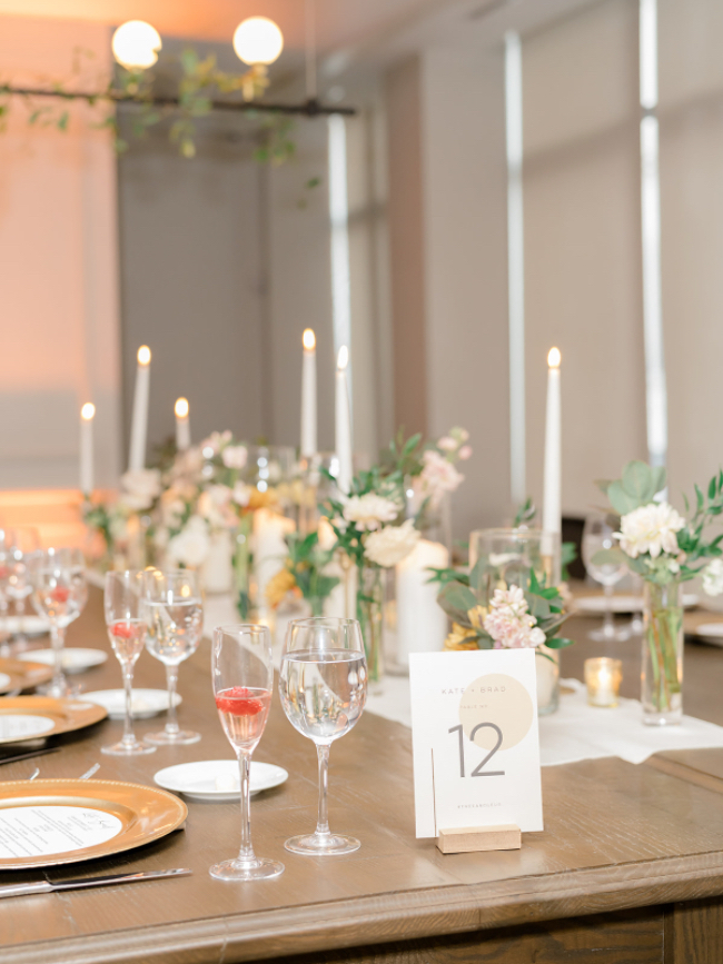 This September wedding embodied the warmth of late summer and early fall with plenty of natural elements like flowers and foliage, while also incorporating gold metallic tones and textures. The colors were sunset-inspired, with warm shades of dusty pink, peach, cream, marigold, and crimson. The bridesmaids were radiant in gowns by Jenny Yoo in English Rose, while the groomsmen donned crisp navy suits from Indochino that added a lovely contrast to the softer sunset tones. Guests were welcomed to the ceremony with a modern seating chart & champagne wall. Guests danced the night away, while a live watercolor artist captured the celebration with unique works of art.