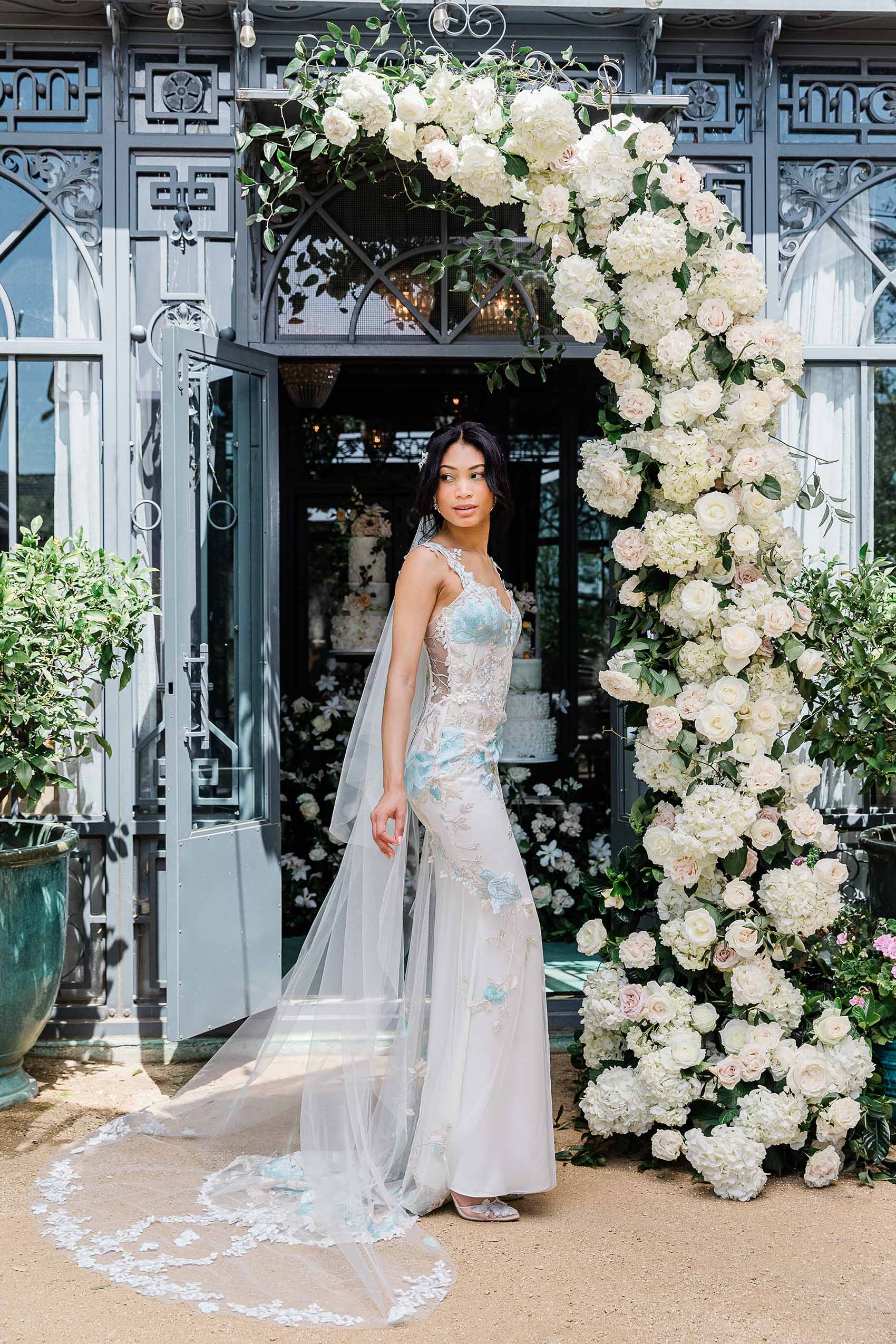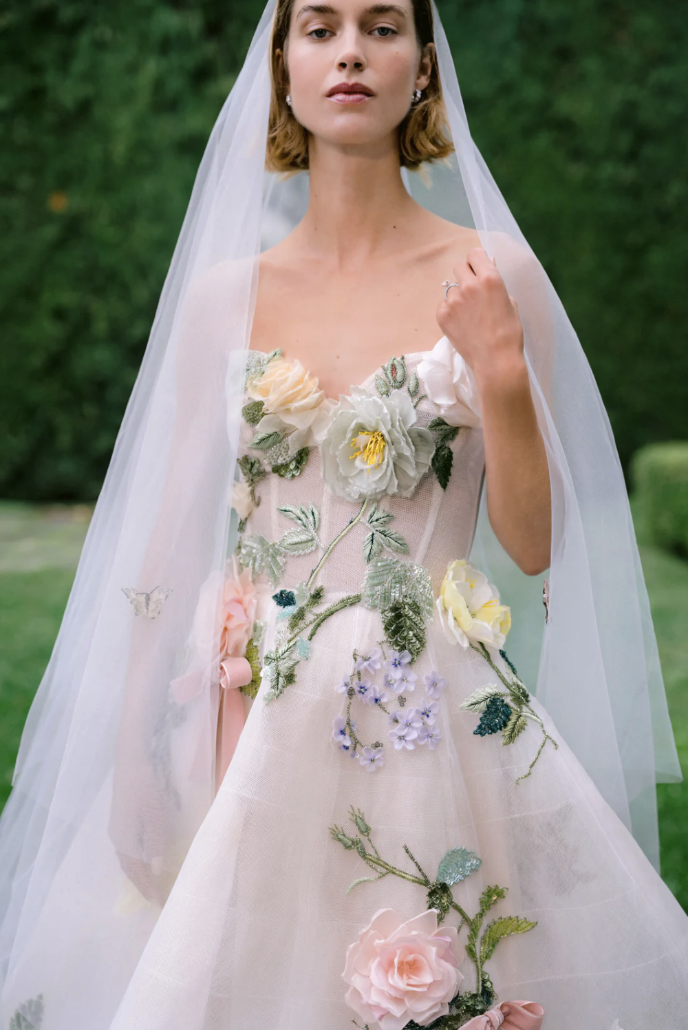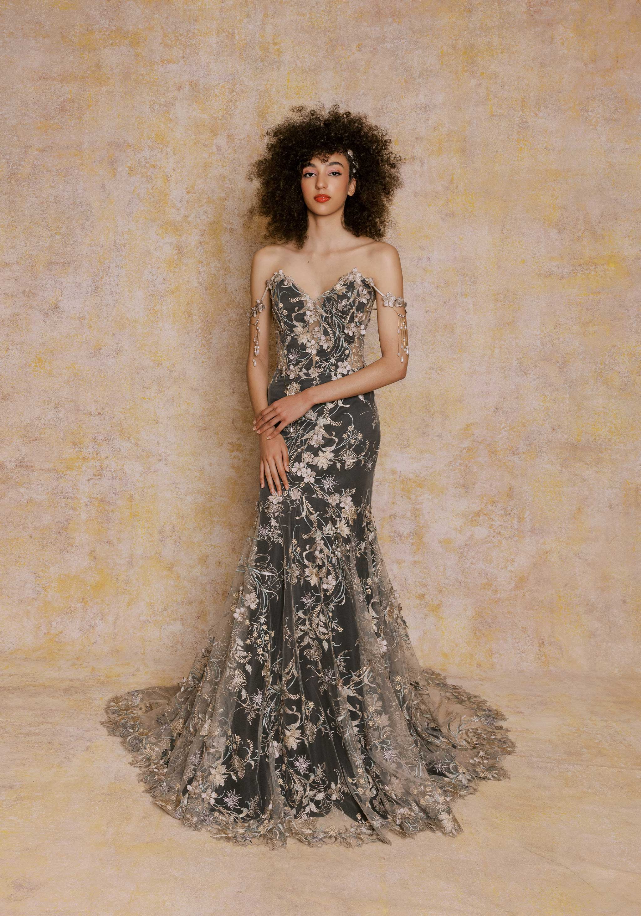 Leave it to Claire Pettibone to create a gown that feels like a golden meadow at sunset. The Lunaria gown is embroidered with 3D florals in champagne, teal, and mauve, with delicate, draped pearls adding an ethereal touch. We love how it transforms the idea of bridal lace into something painterly and alive. And while it’s shown here lined in black silk for striking contrast, brides can choose from softer linings too. Either way, it’s a gown that shimmers with magic.