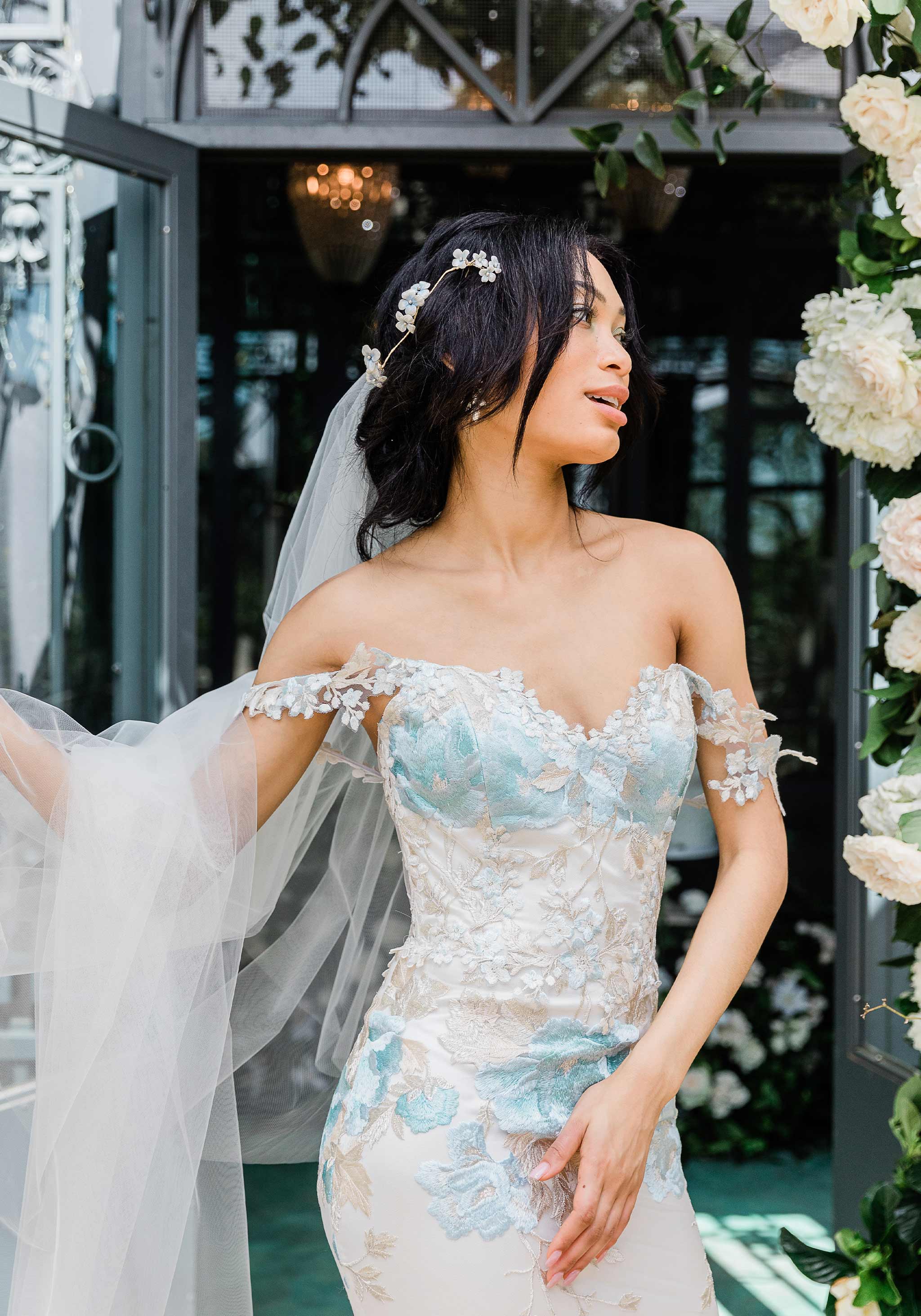 “Something blue” just got a couture upgrade. Odessa Blue blooms with delicate azure embroidery along silver branches, creating a dreamy, painterly effect on the fit-and-flare silhouette. We love how versatile this gown is; the floral appliqué straps can be worn on the shoulder for a chic frame, or off the shoulder for romance. It’s one of those colorful wedding dresses that feels like fine art.