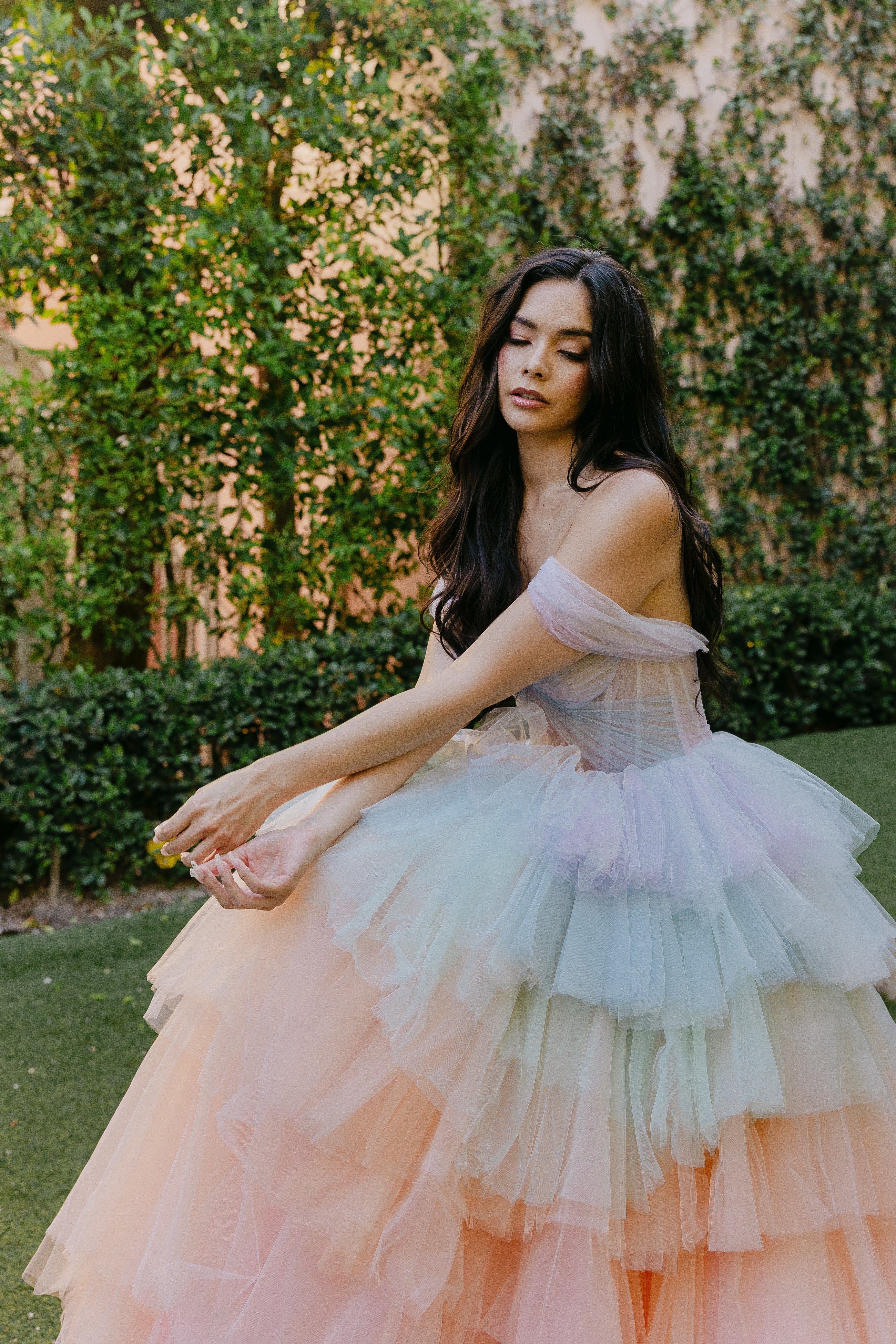 Few gowns feel as joyful as this one. After the Storm is a rainbow ballgown layered with multi-colored tulle and finished with a cathedral train. Beyond its stunning volume, what makes this gown unforgettable is the inspiration behind it: the joy of spotting a rainbow after the rain. We love it because it’s a wearable celebration, bright, bold, and unapologetically full of life. For brides searching for colorful wedding dresses that radiate happiness, this one is pure magic.