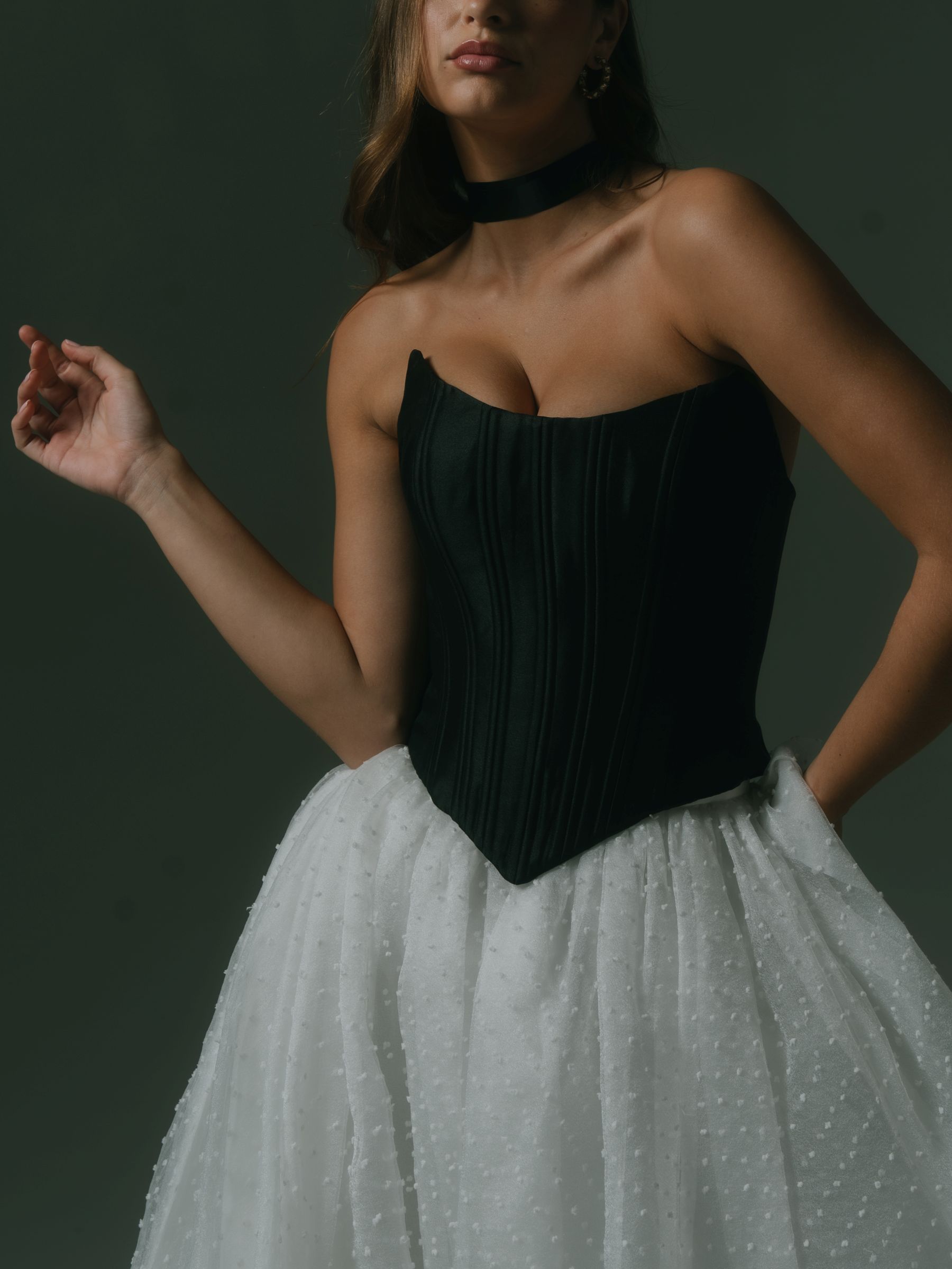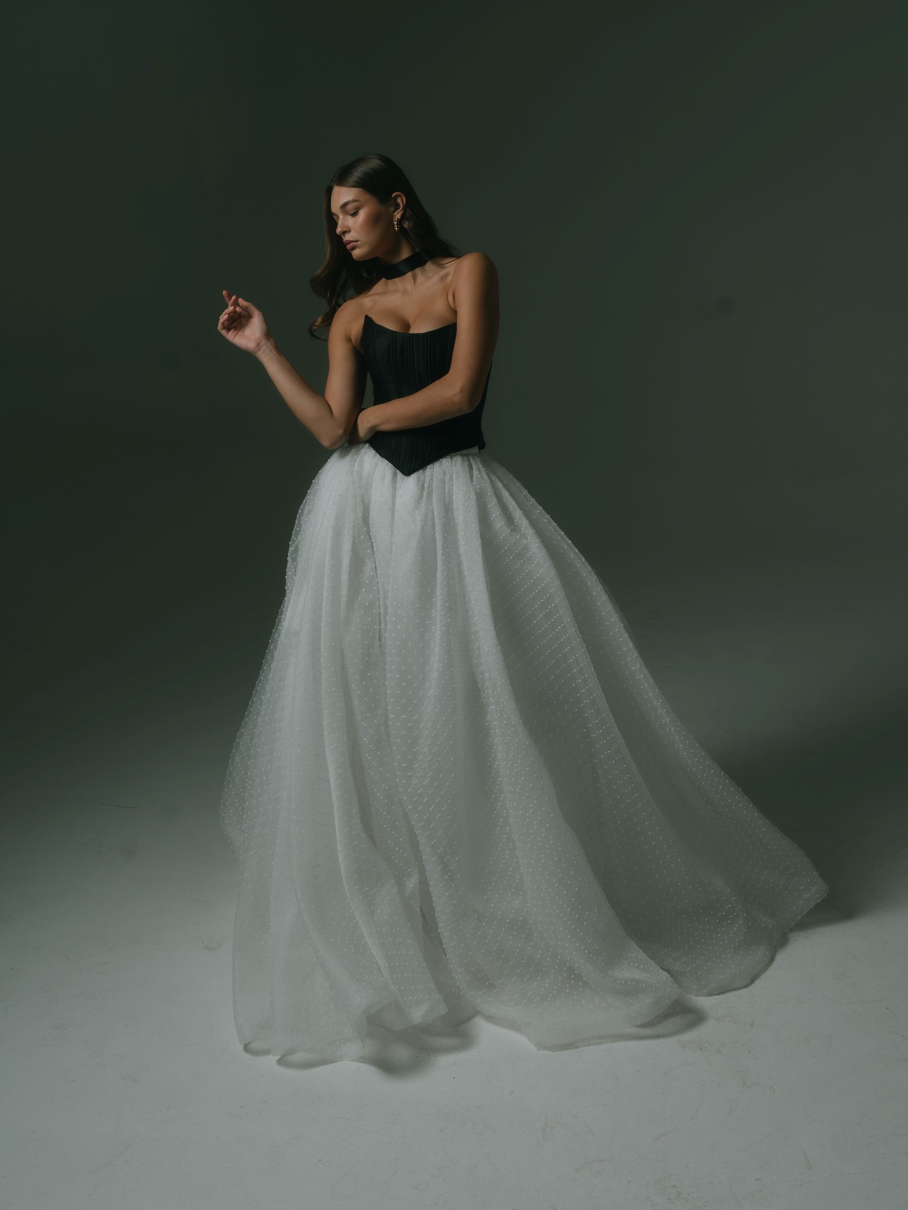 We’re always here for a mix-and-match bridal look, and Hera Couture nailed it with this pairing. The structured Bernini corset brings vintage-inspired detail (that exposed boning and pearl closure are perfection), while the Vita skirt adds playfulness with its airy layers of polka-dot organza. And yes, this combo can be created in classic ivory, but we love the drama of the black corset against that light, voluminous skirt. It’s proof that colorful wedding dresses don’t always have to mean pastels.