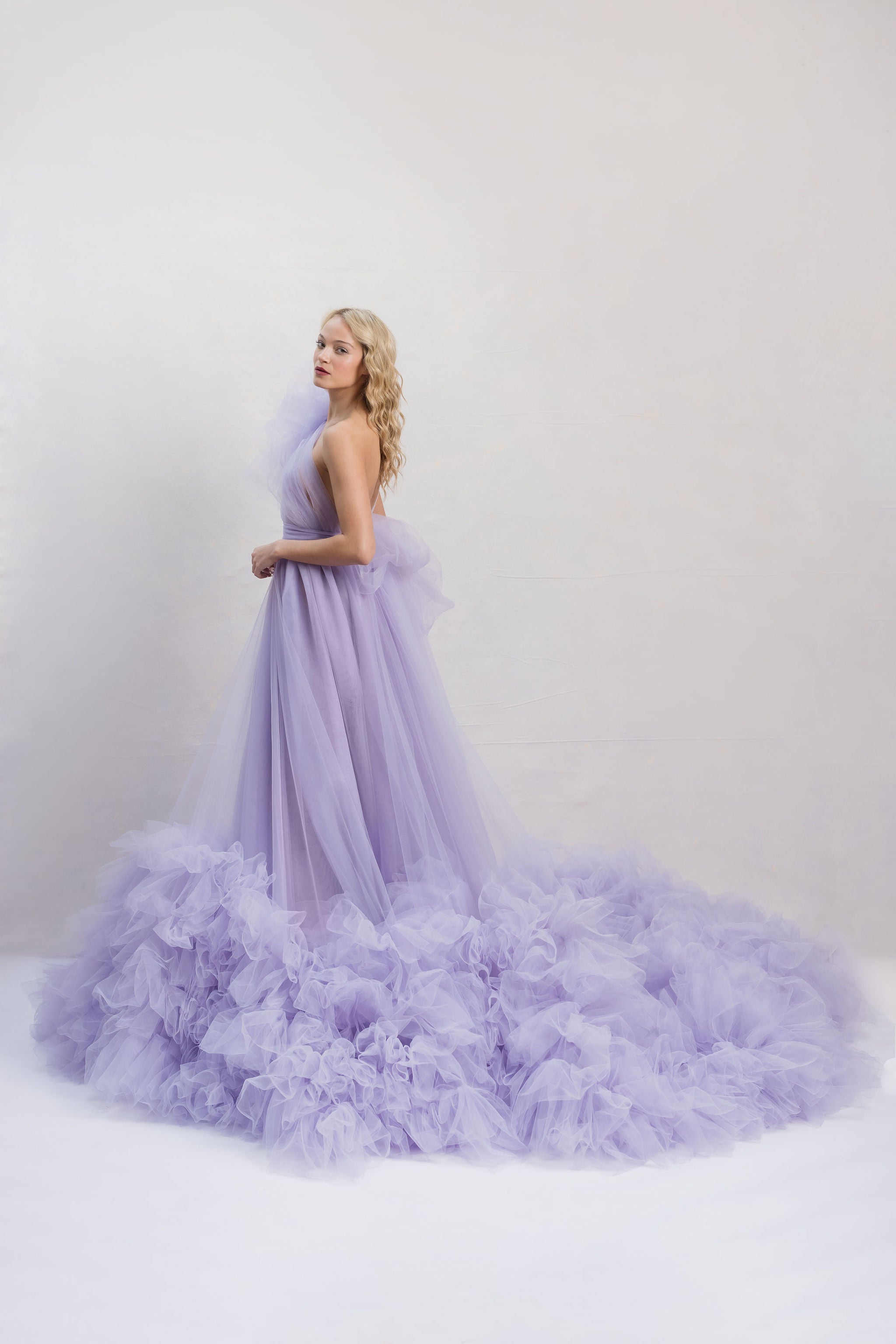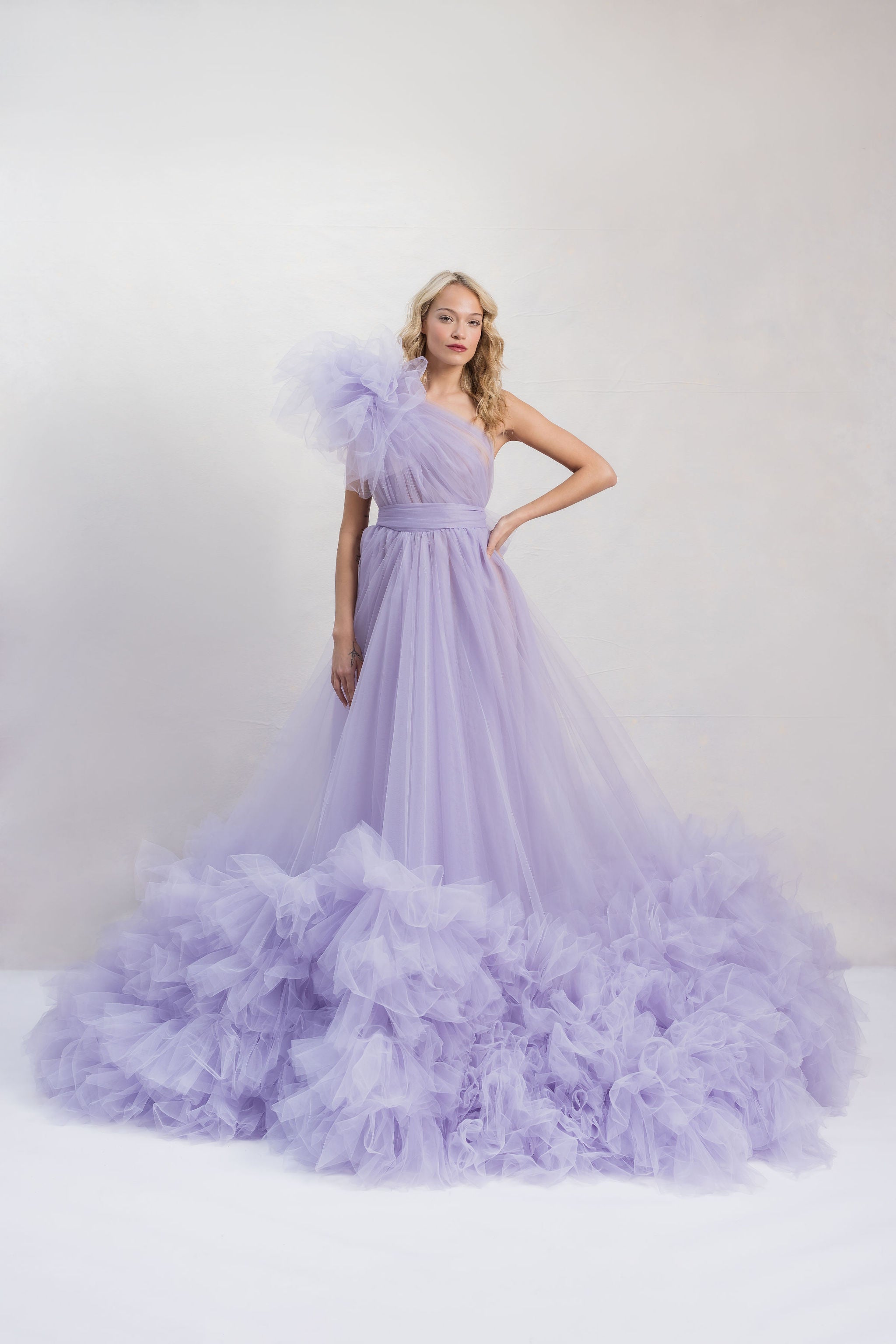 Lavender tulle, endless ruffles, and an asymmetrical shoulder, need we say more? The Calla gown by Millia London is for the bride who isn’t afraid of color or volume. The layers of frothy lilac tulle feel playful yet couture, and we love how the gown moves with every step. It’s dramatic in the best way, perfect for a fashion-forward bride (or as a second look for the reception).