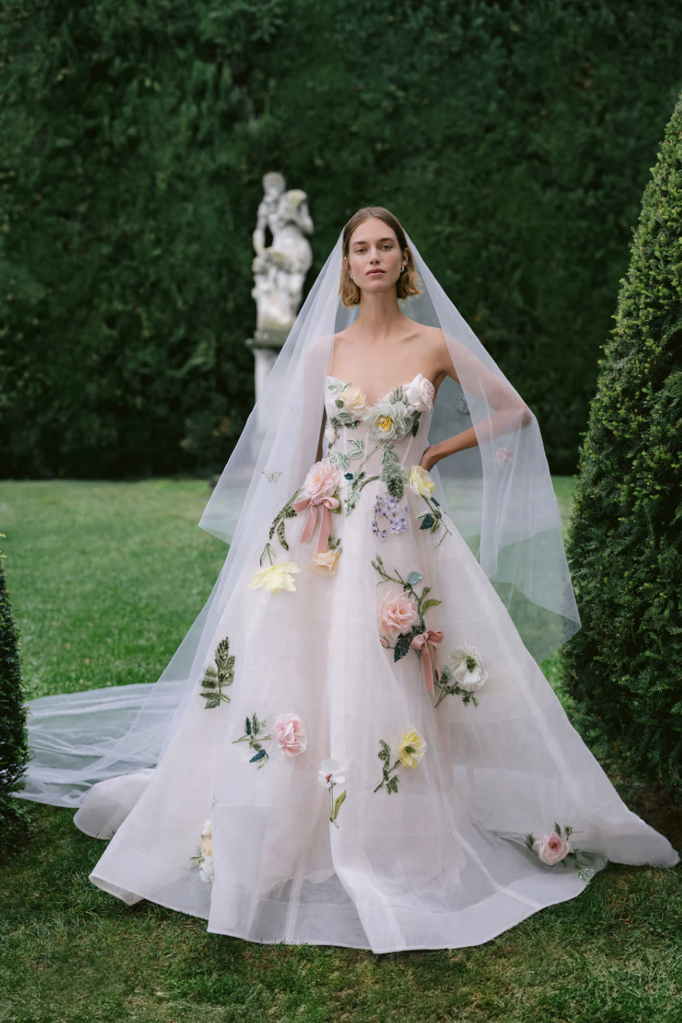Monique Lhuillier is the queen of dreamy florals, and the Amalfi gown might just be one of our favorites. Covered in delicate 3D floral embroidery, this strapless ball gown feels like stepping straight into an Italian garden. It’s soft, feminine, and impossibly romantic. It’s perfect for the bride who wants to wear flowers in the most enchanting way possible.