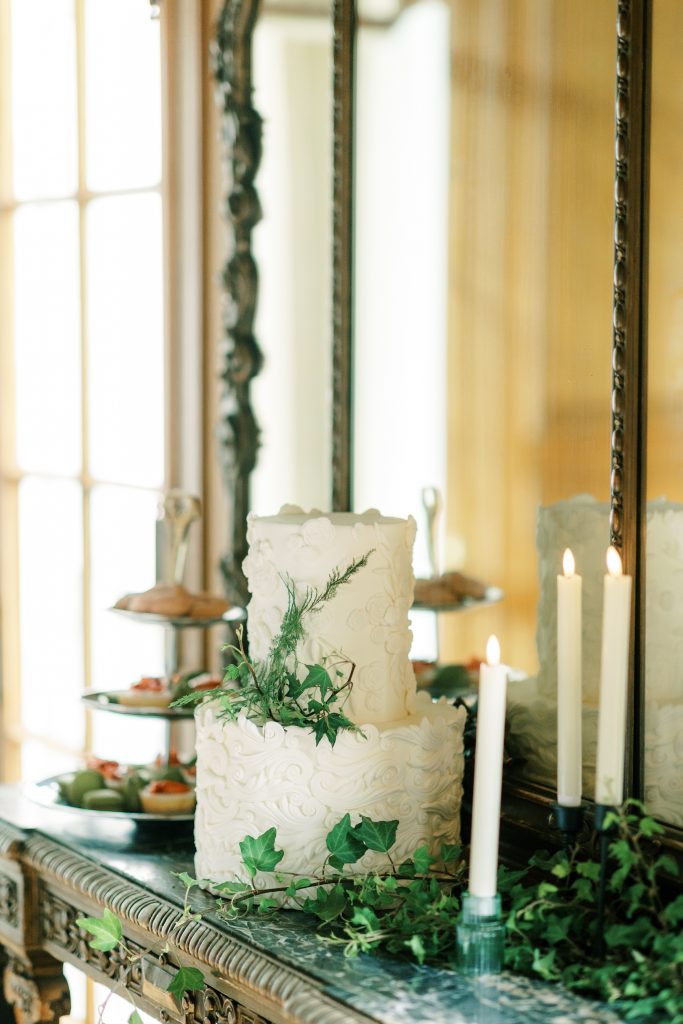 “To maintain an elegant appearance and embrace the darker tones, we decorated The War Memorial with rich greens and golds. Organically-placed bouquets and florals arrangements brought life and intention to the interior, while the Hamilton was crowned with its own colorful accents. The bride and groom’s floral accents felt united and yet still unique as delicate pops of yellow adorned the white and green palette of the bouquet and boutonniere.