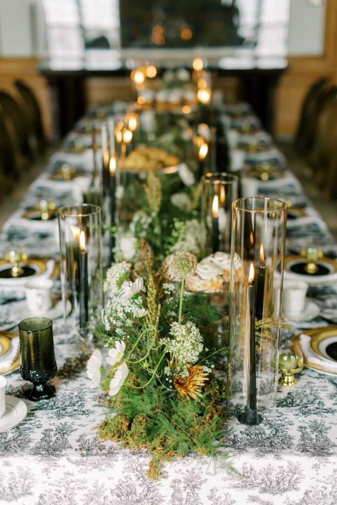 Starting with the personalized tea cups upon entry to the venue, guests were transported into a different time period. Whilst guests sipped on their tea, they felt as if they were dining amidst a garden as the flowers organically grew up from the table itself. Instead of making guests leave their seats during the festivities, all of the delicious pastries and and desserts were kept just within reach as the reception table literally flowing with delicious delicacies. Pairing perfectly with the macaroons at each place setting, the sweet smells naturally filled the room, further enhancing the experience for all who entered.”