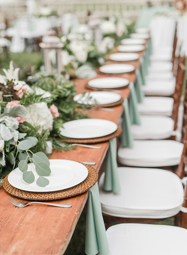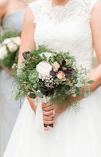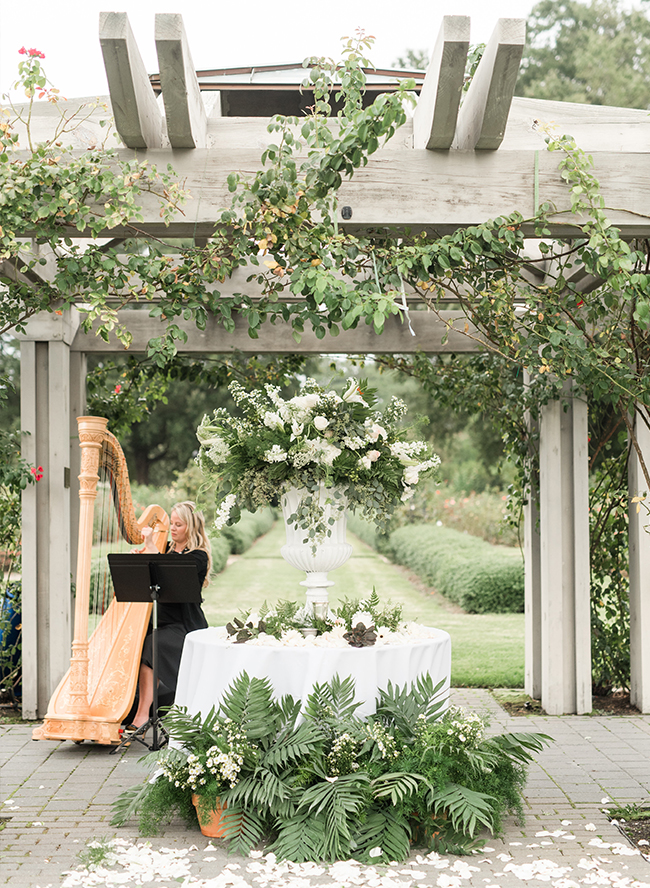 I was practically raised outside in the garden – long walks and picnics at various botanical gardens were a favorite activity in my youth. So when it came time to select the wedding venue of my dreams, the Norfolk Botanical Gardens was the only option that gave me goosebumps! The romance of the rose garden and the formality of the Renaissance Court inspired the woodland fairytale theme. Additionally, William Shakespeare’s “A Midsummer Night’s Dream” helped to define the manner in which the wedding and reception florals and decor would come together. Ferns, mosses, succulents, cabbage roses, lilies, wood planks with mushrooms, white hydrangeas and fairy lights completed the vision.