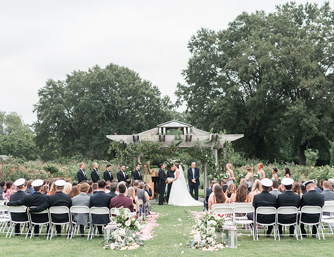 Get ready, this wedding will give you chills. The Virginia rose garden wedding couldn’t be more classic or intimate. We love the garden ceremony and the courtyard reception. Also, a market lit tent makes it even more dreamy! We know you will love the blush & green florals and swoon over the multi-tier naked cake. So get on with it! Enjoy this beautiful, romantic, military wedding at one of Virginia’s finest venues.